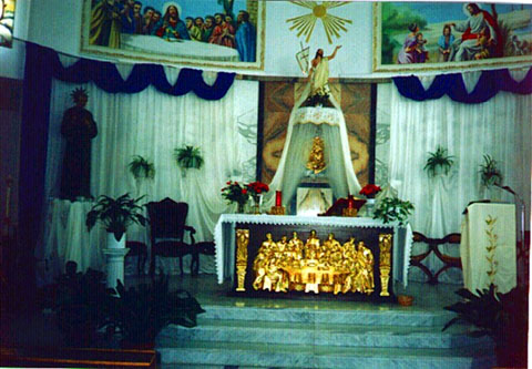 e presenta un altare centrale in legno, arricchito da tanti bassorilievi